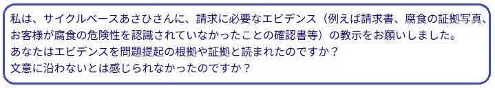 あとそもそもにして、【エビデンスを求める】というところがおかしいです。私は、サイクルベースあさひさんに、請求に必要なエビデンス(例えば請求書、腐食の証拠写真、お客様が腐食の危険性を認識されていなかったことの確認書等)の教示をお願いしました。