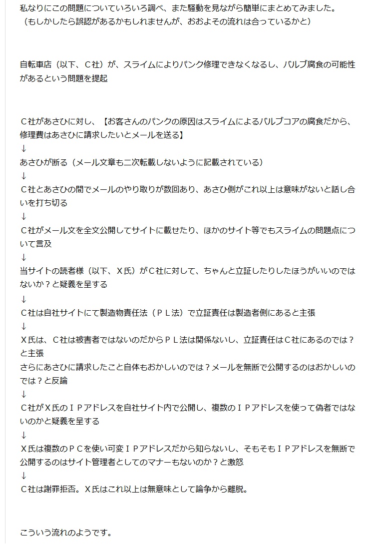 追記もしているので、内容が少し変わっていますが、サイクルベースあさひさんは、スライムによるバルブ腐食を認めたのかに対して頂いた論評です。